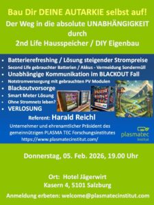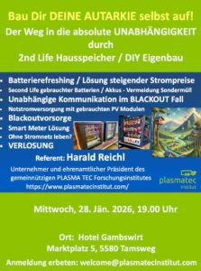 Der Kostengünstige Weg in die Autarkie durch Hausspeicher Themen wie: Batterierefreshing das 2. Leben gebrauchter Batterien und gebrauchter Photovoltaik-Module alternative Technologien Notstromvorsorge und Blackoutvorsorge werden hier durch den Experten und