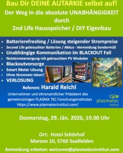 Hausspeicher 1-Tages-Workshop Das gemeinnützige PLASMA TEC Forschungsinstitut (PTFI) wird diesen Workshop durchführen. PLASFOUR fördert und unterstützt die Aktivitäten mit Marketingkampagnen. PTFI wird Dir in mehreren, theoretischen Teilen hochwertiges Wissen vermitteln